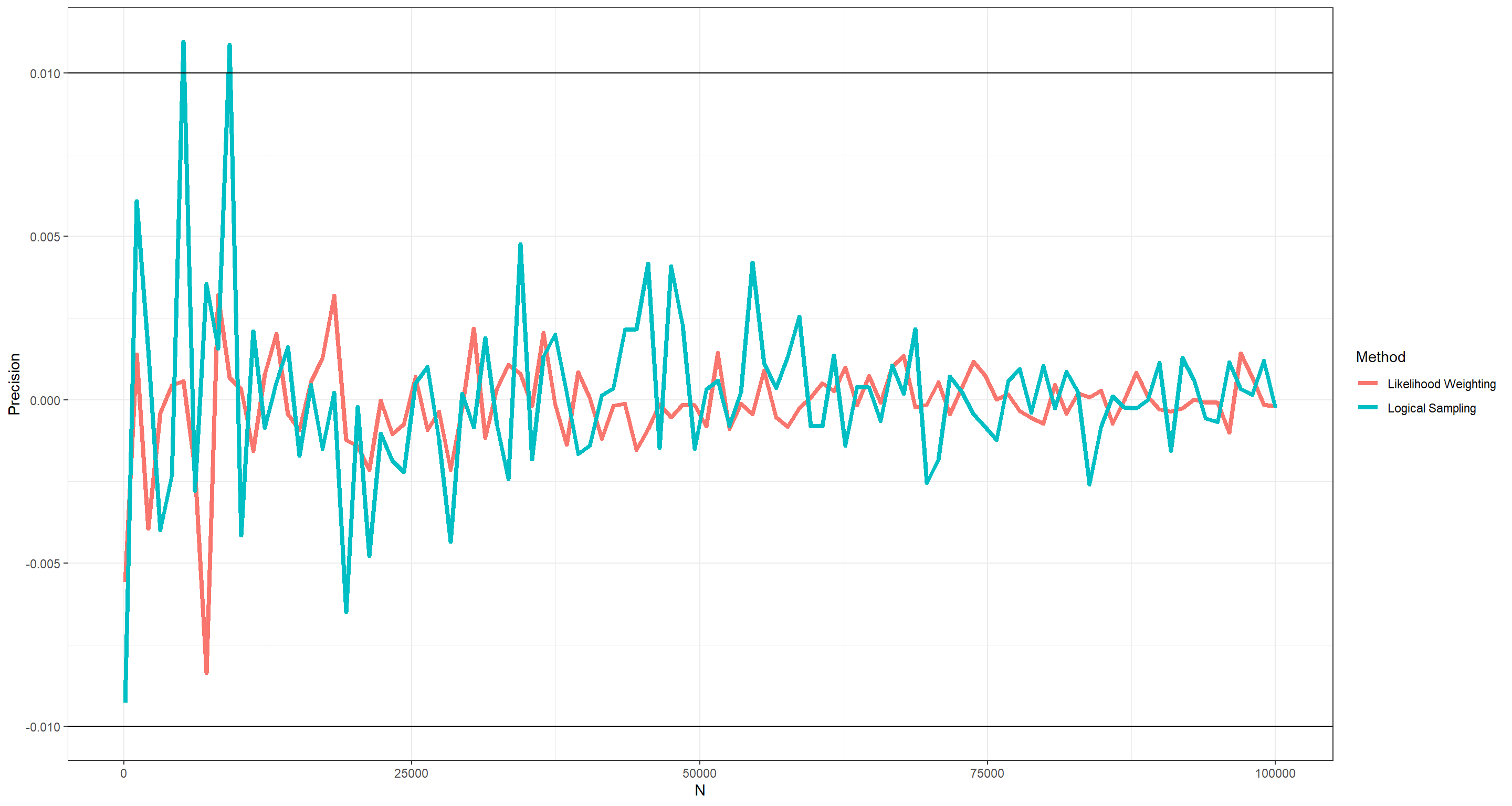 Method = rep(c("Likelihood Weighting", "Logical Sampling"), each = length(n_seq))