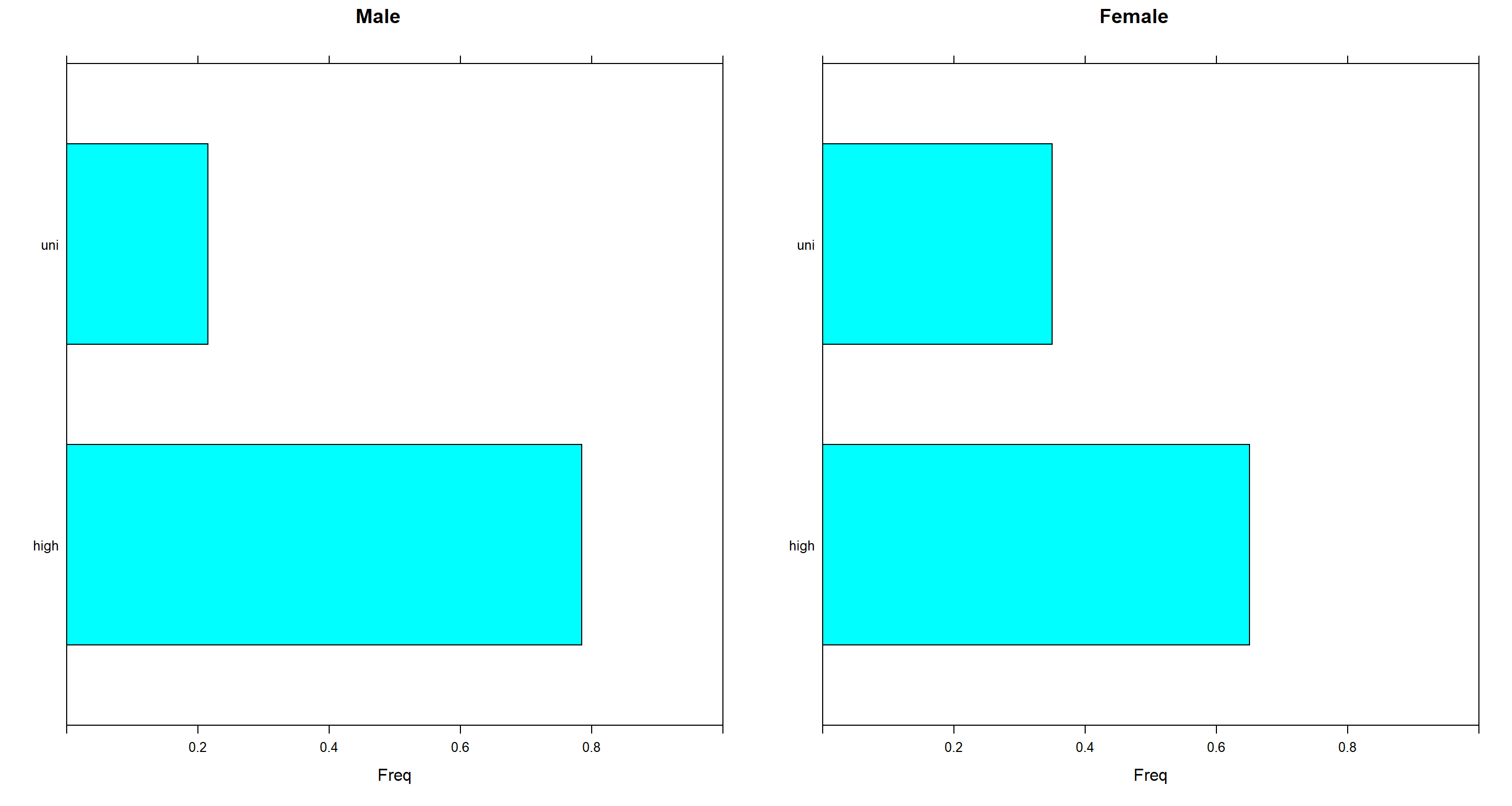 p2 <- barchart(querygrain(jfemale, nodes = "E")$E, main = "Female", xlim = c(0, 1))
