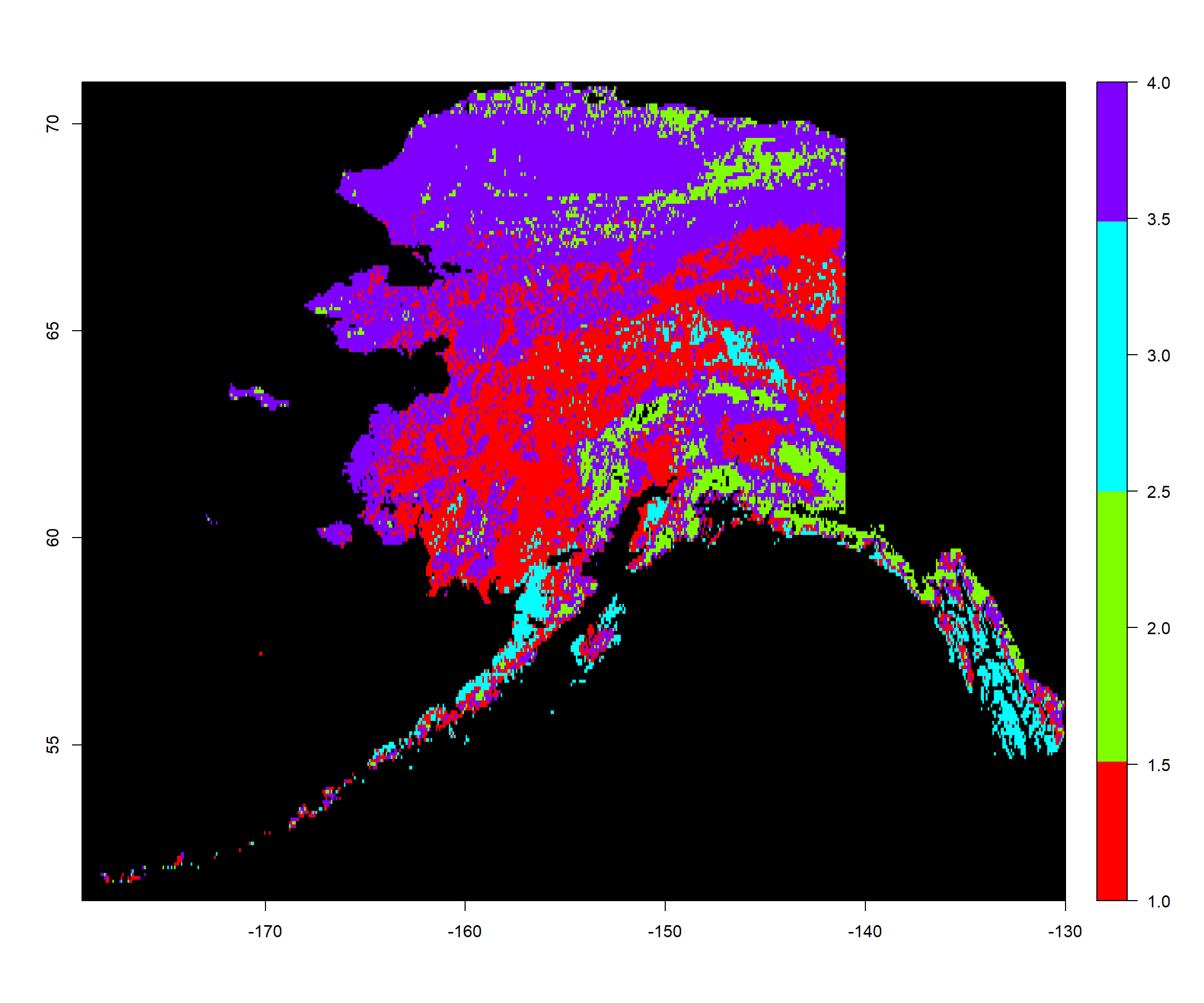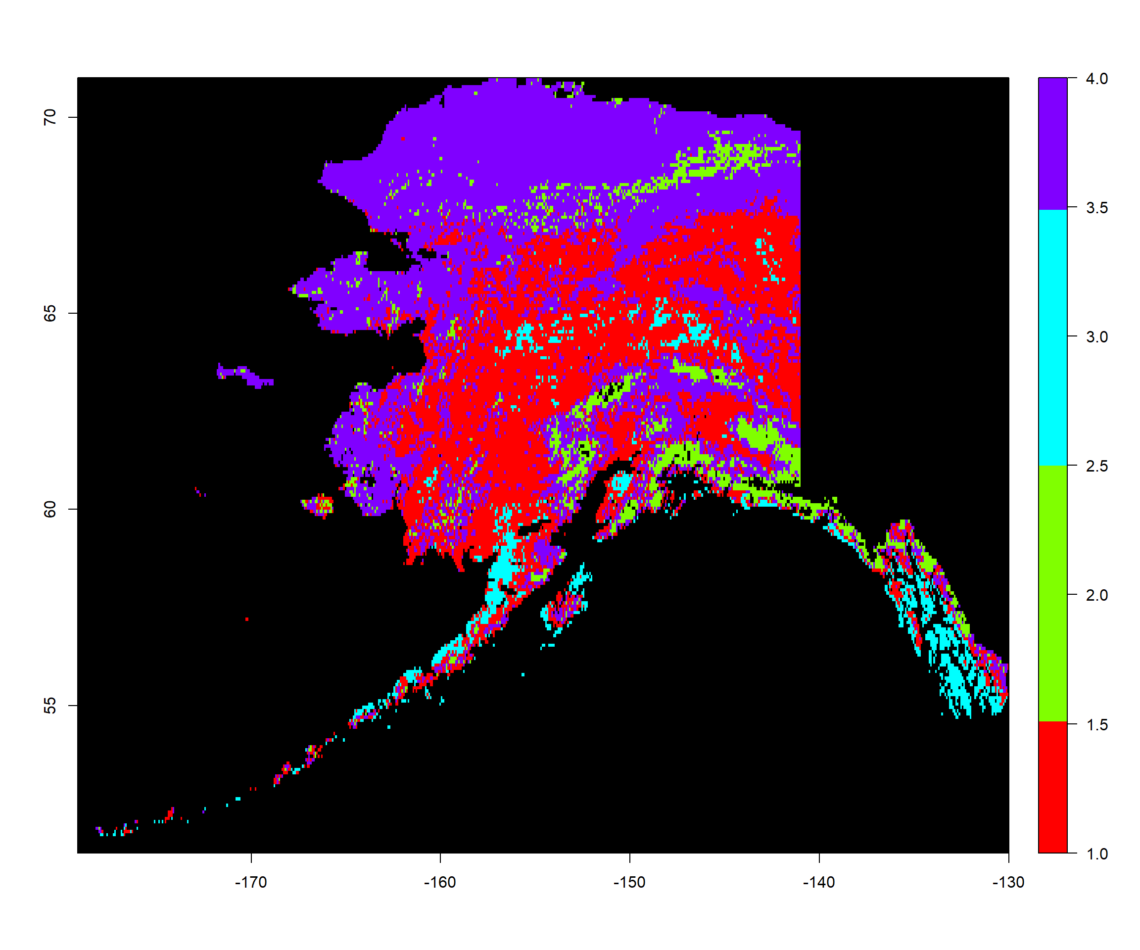Let’s deal with the 1982 data first. mod2 is the mclust model object for 4 clusters from our last exercise. Here, we predict clusters and place them on a raster: