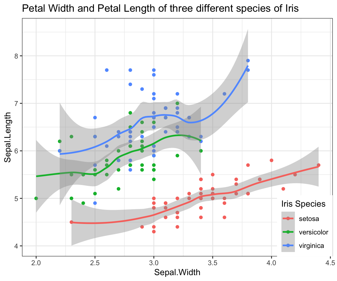 aes(x=Sepal.Width, y=Sepal.Length, colour = Species) # aesthetics