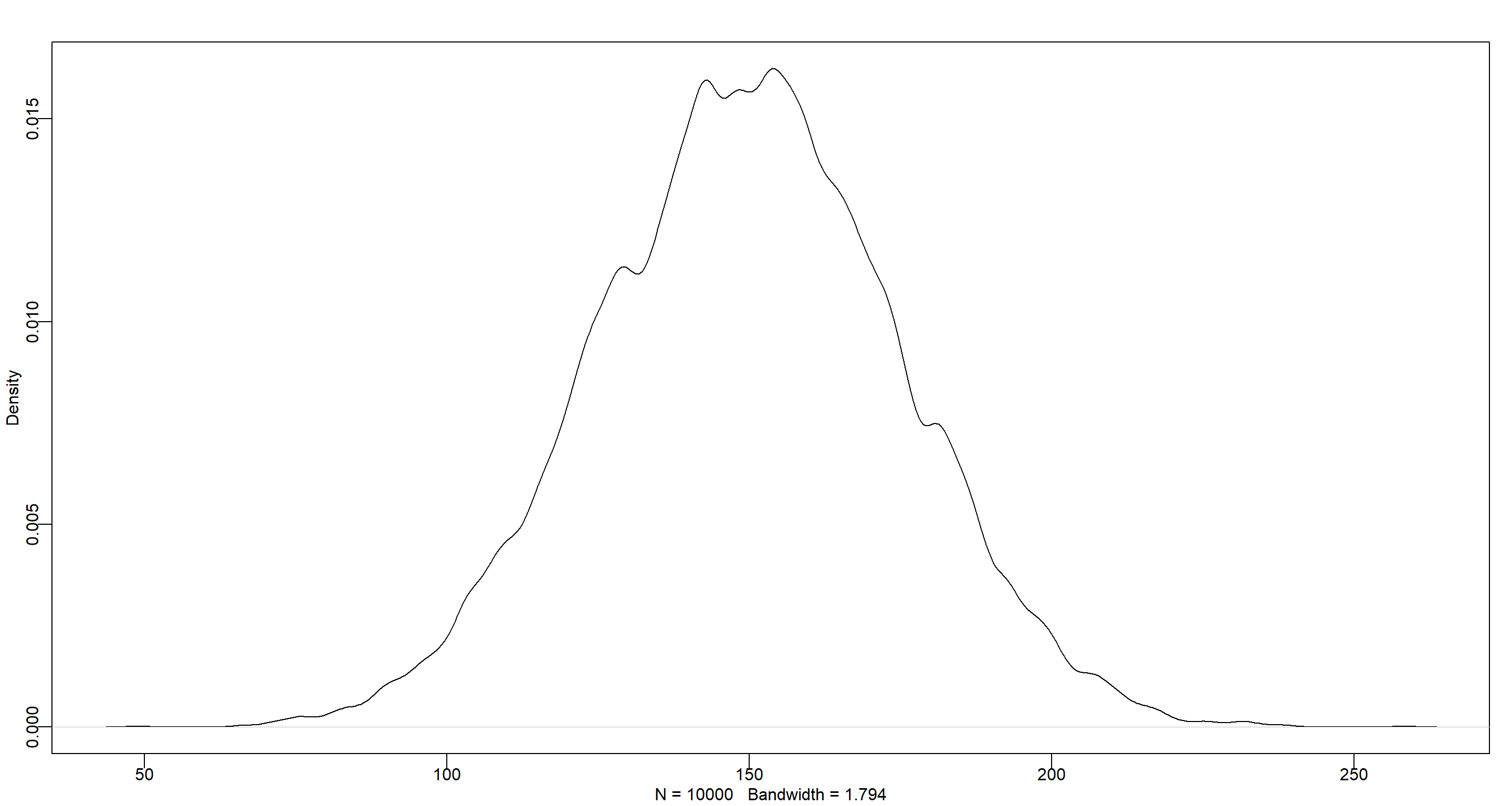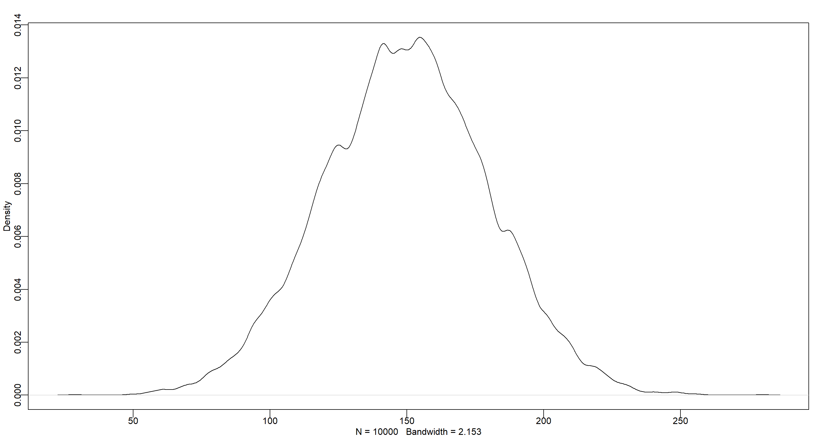 dens(rnorm(1e4, 150, 30))