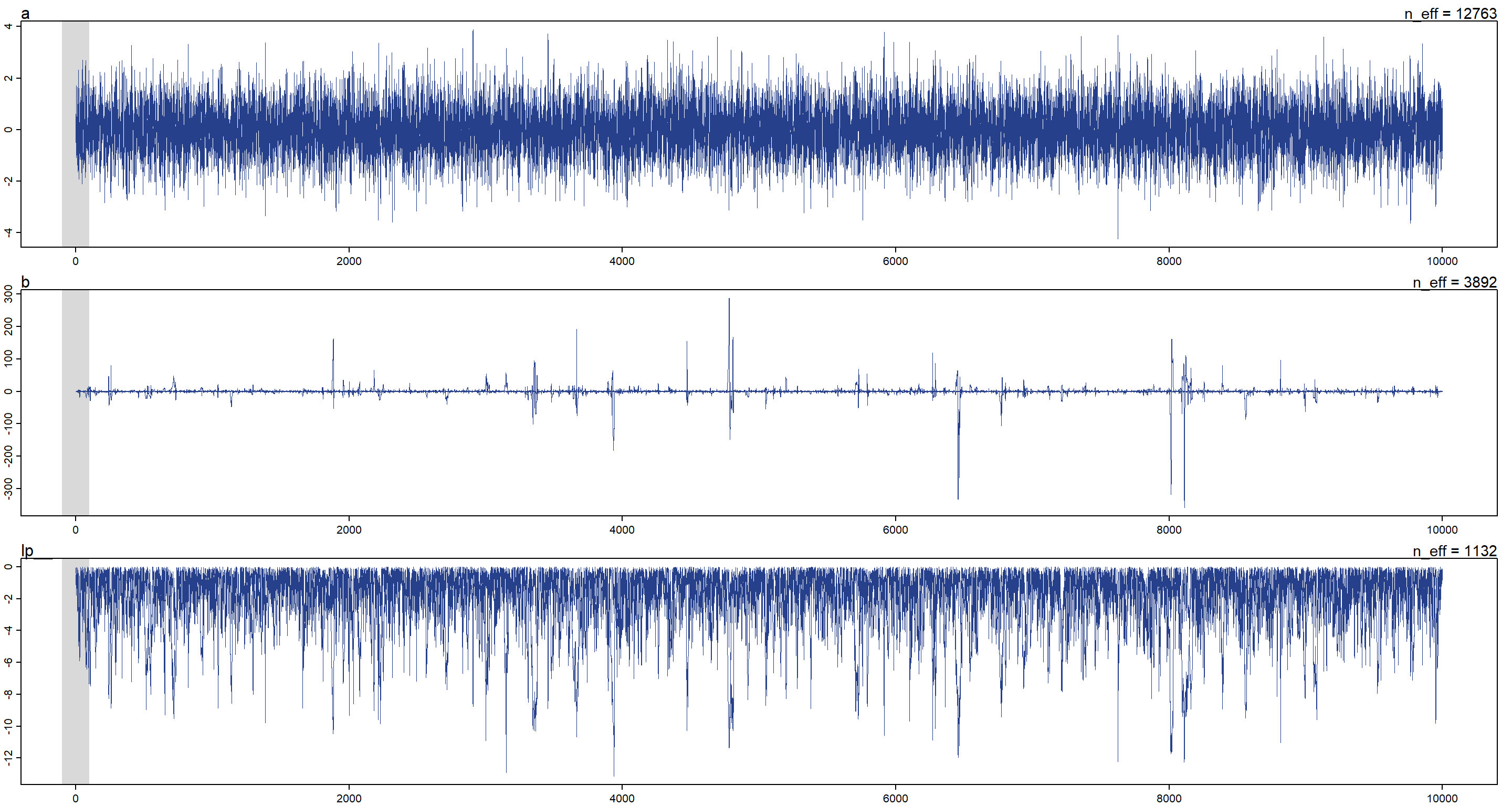 These trace plots show that the chains quickly find the region with highest posterior probability and stay there.