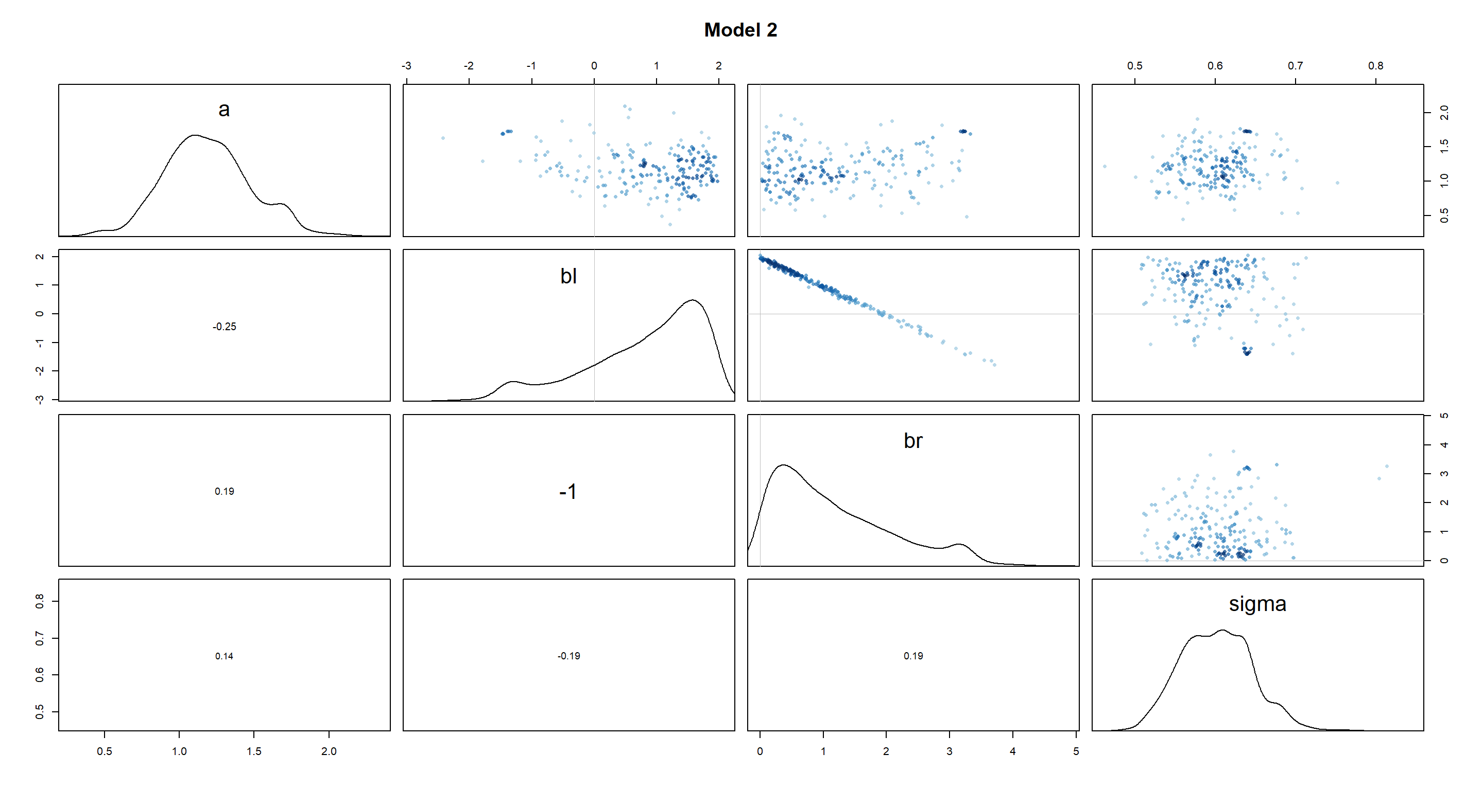 As we can see, the beta distributions have shifted drastically between the different models. Interestingly, bl and br were perfectly symmetric in m5.8s, but are skewed in m5.8s2. Given how the height of a person is approximated in both models (a + bl*leg_left + br*leg_right), the distributions of leg lengths are necessarily negatively correlated (you can be of the same height with a short right leg and long left leg, long left leg and short right leg, or two medium-length legs). Thus, by setting br to be strictly positive in m5.8s2 and made it skewed, we have forced bl to be equally skewed in a mirror image of br.