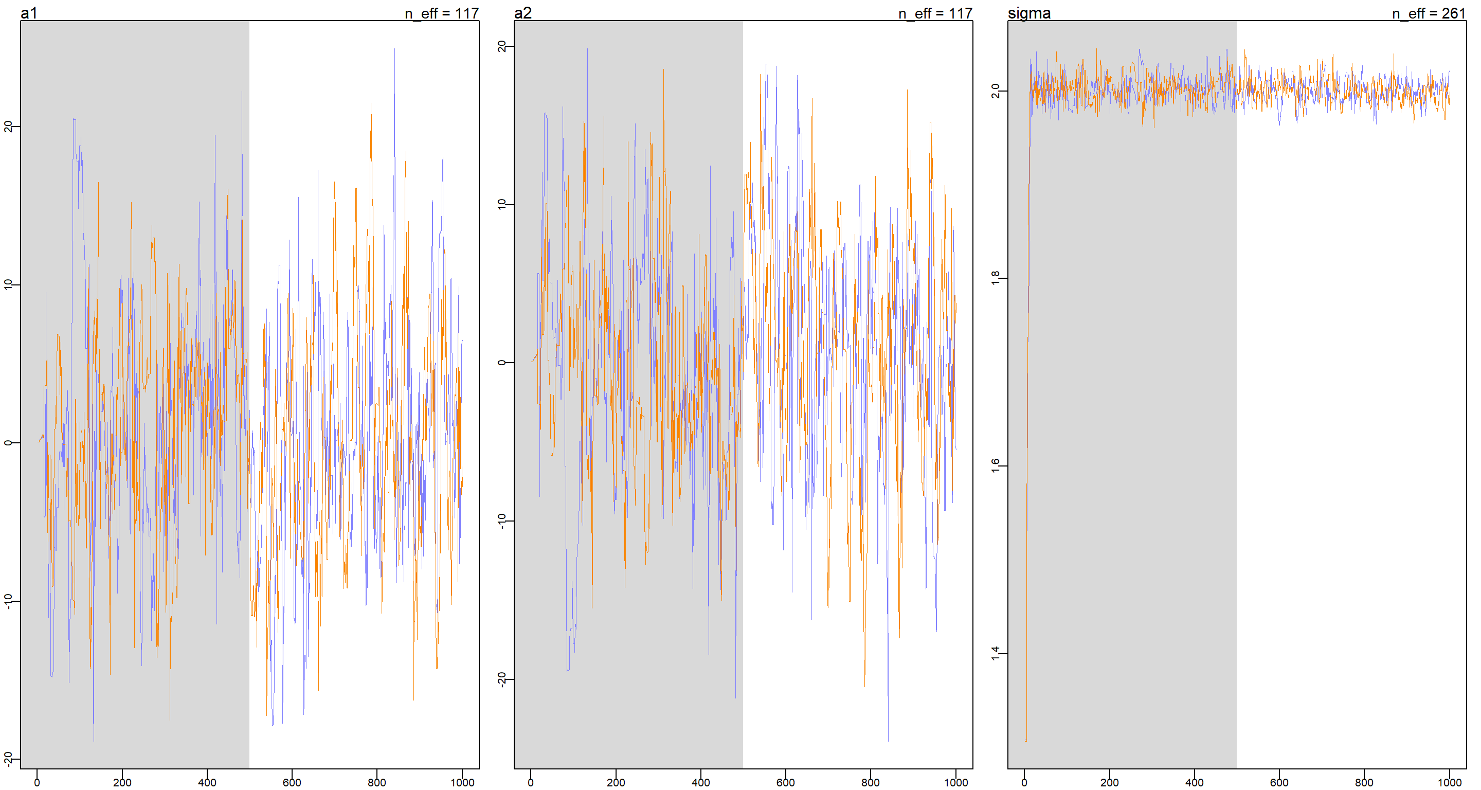 This is a problem of unidentifiable parameters as a1 and a2 can cancel each other out to arrive at the correct mu and so we see non-stationary behaviour in the trace plots of a1 and a2 while the trace plot for sigma is doing alright.