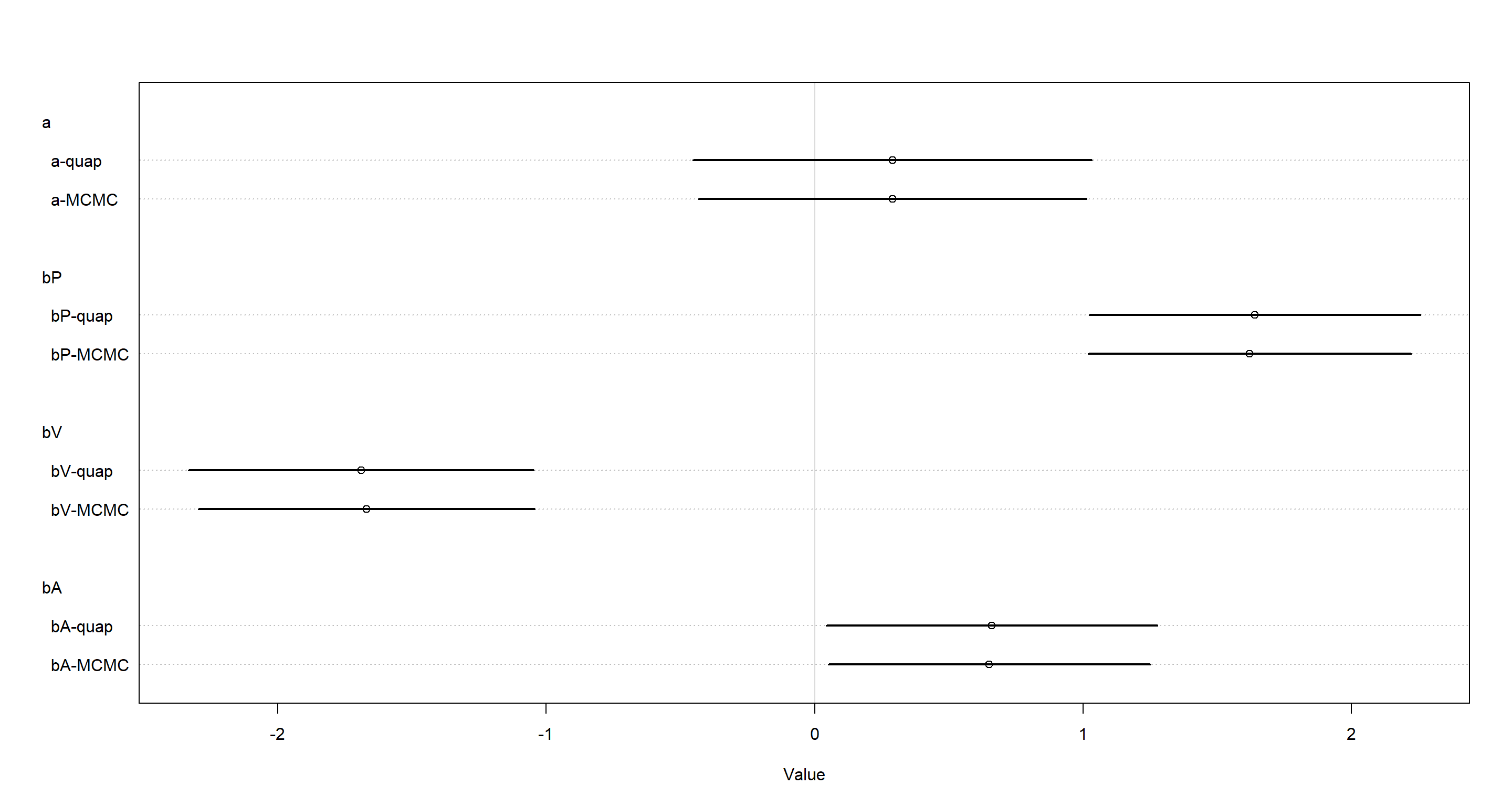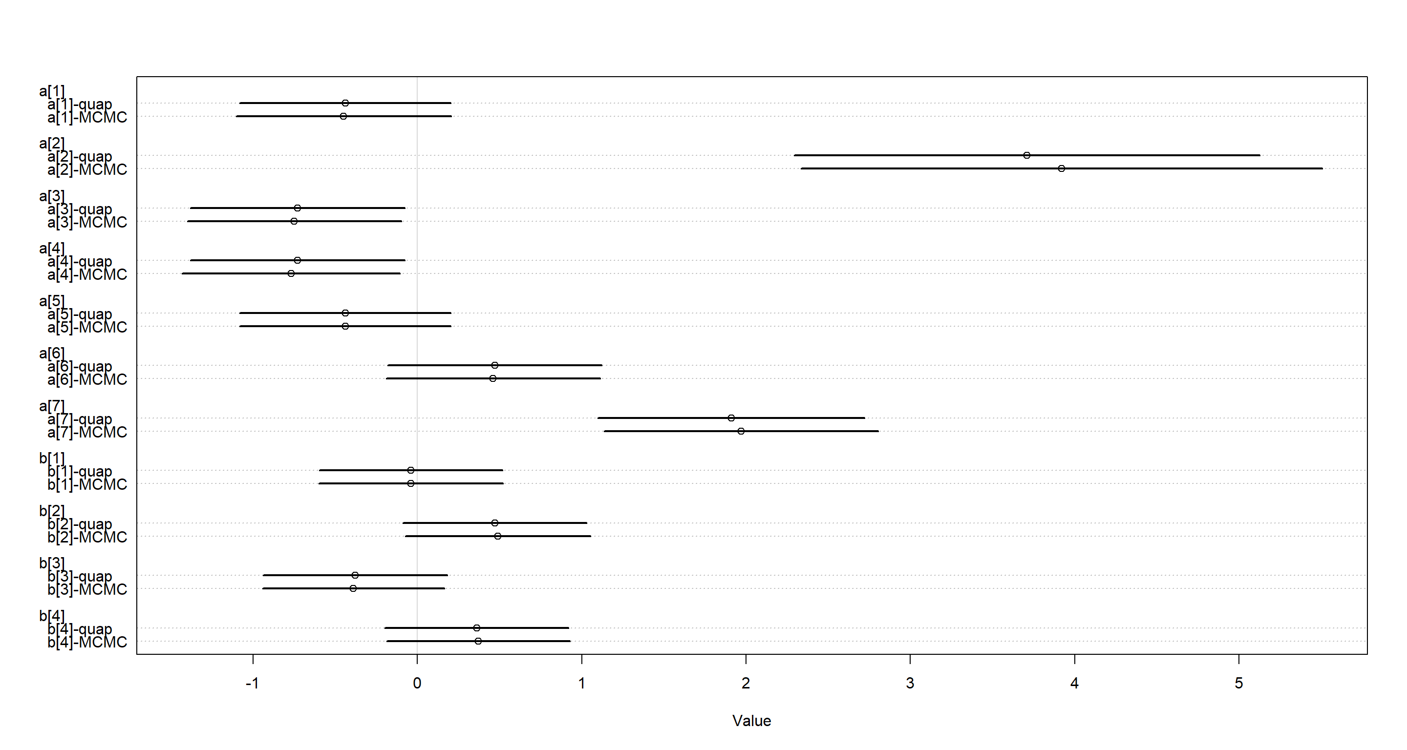 rep(c("MCMC", "quap"), nrow(coeftab(mH4a, mH4aquap)@coefs) * 2),