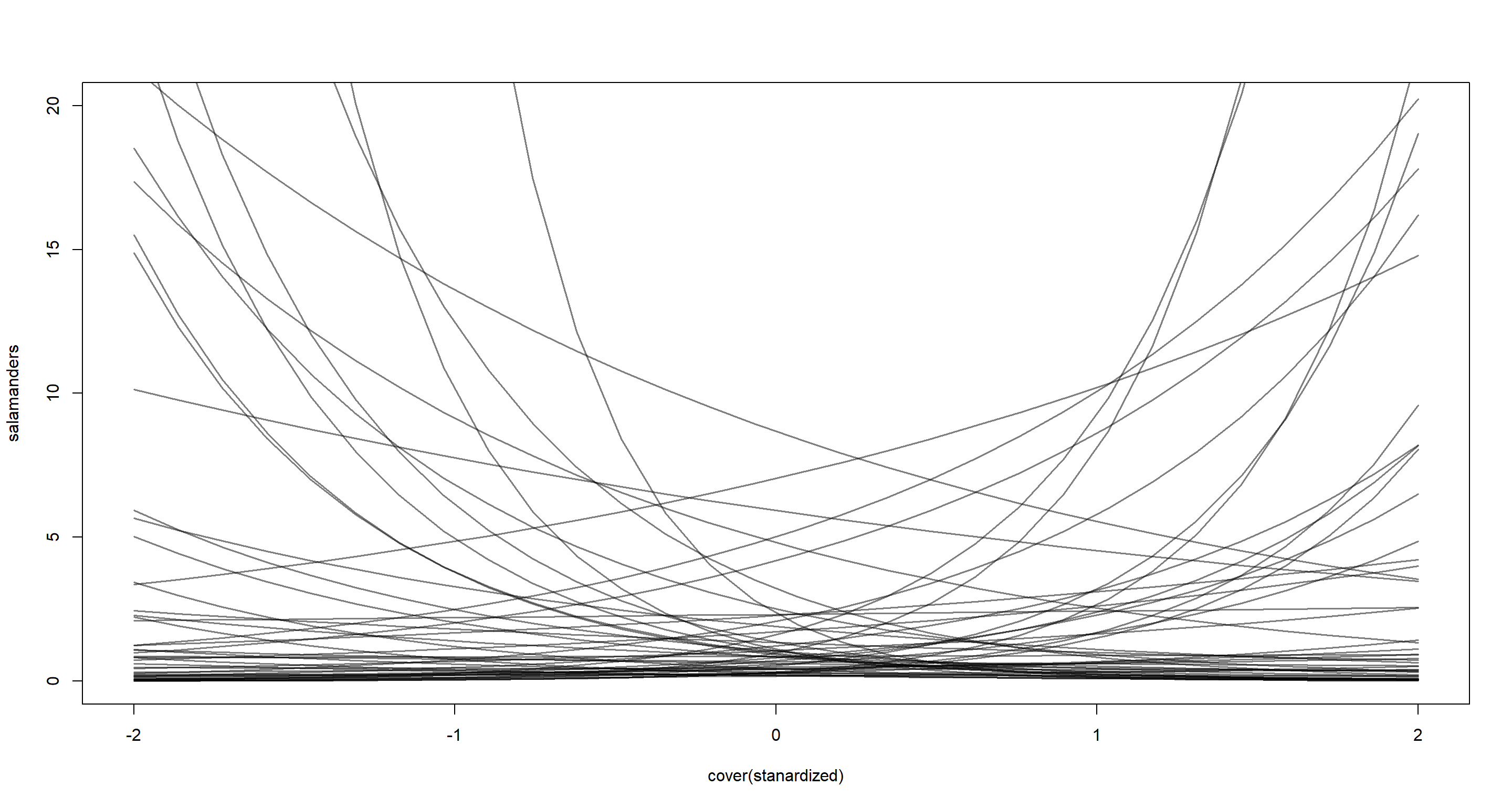 xlab = "cover(stanardized)", ylab = "salamanders"
