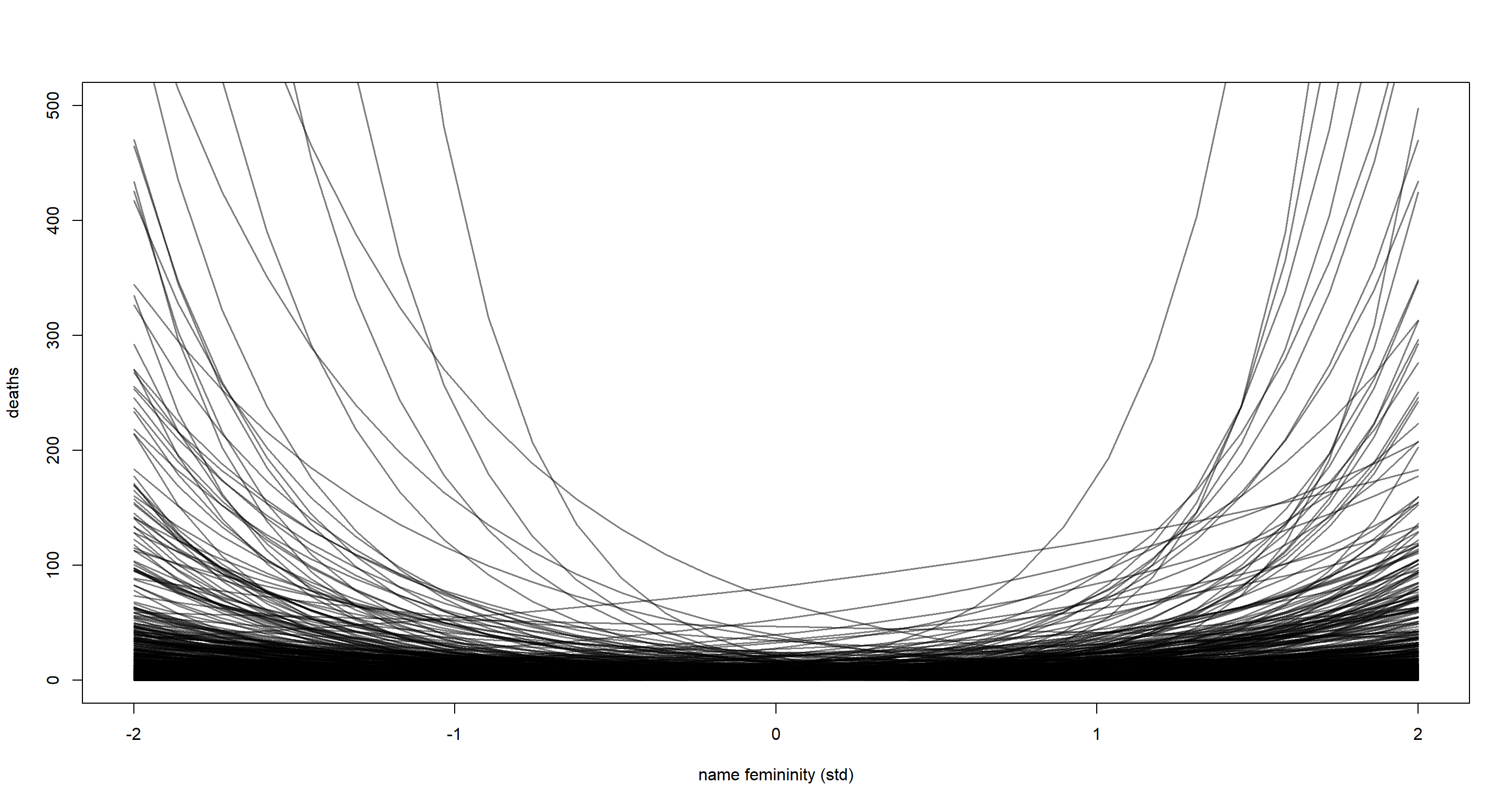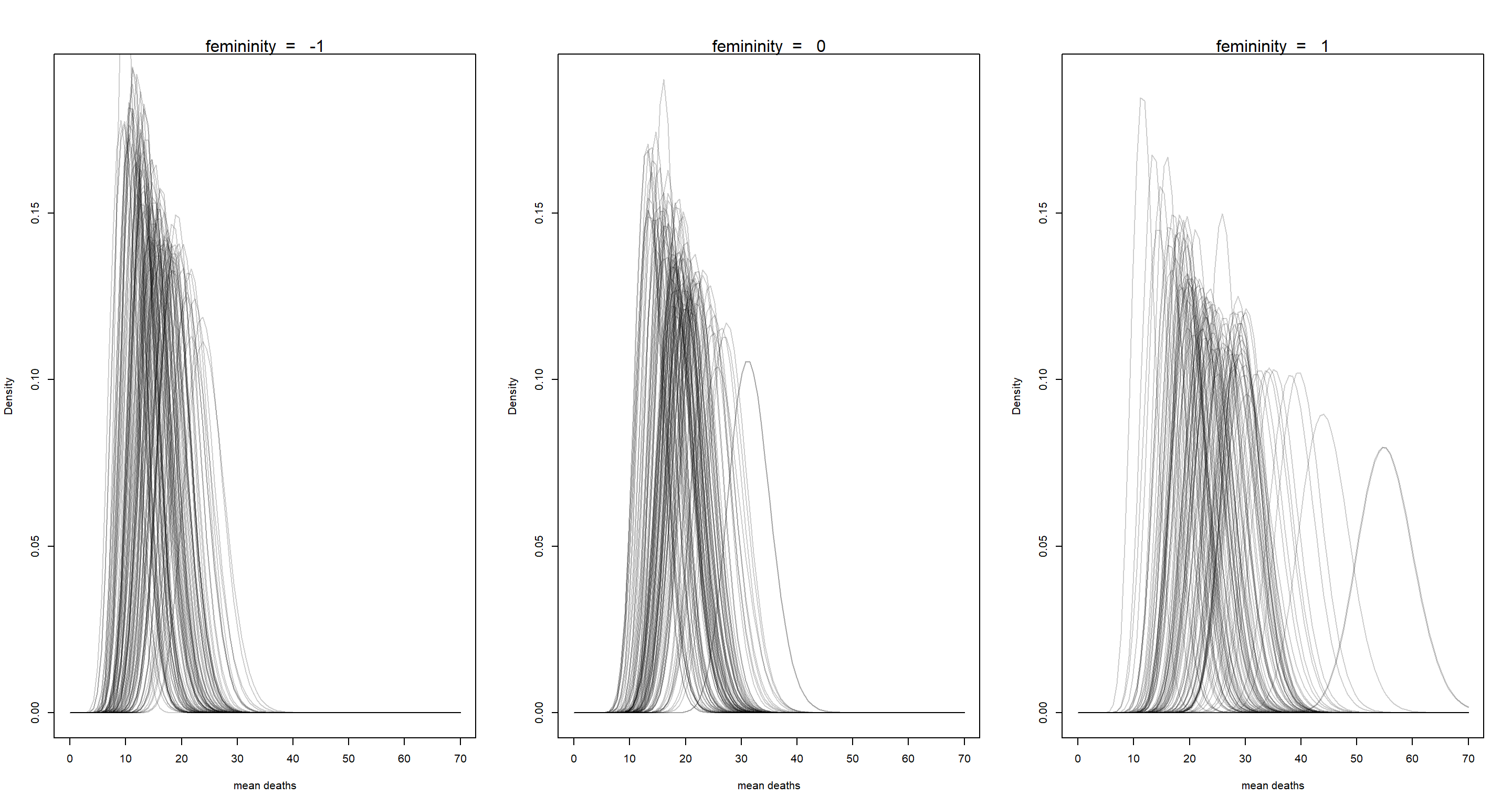 I’d think that’s pretty alright. We allow for both positive and negative trends between death toll and femininity of hurricane name, but don’t have a lot of explosive trends in our priors. These strong trends are quite unintuitive. Our vast majority of trends however are very ambiguous and so I proceed with these priors and run the model: