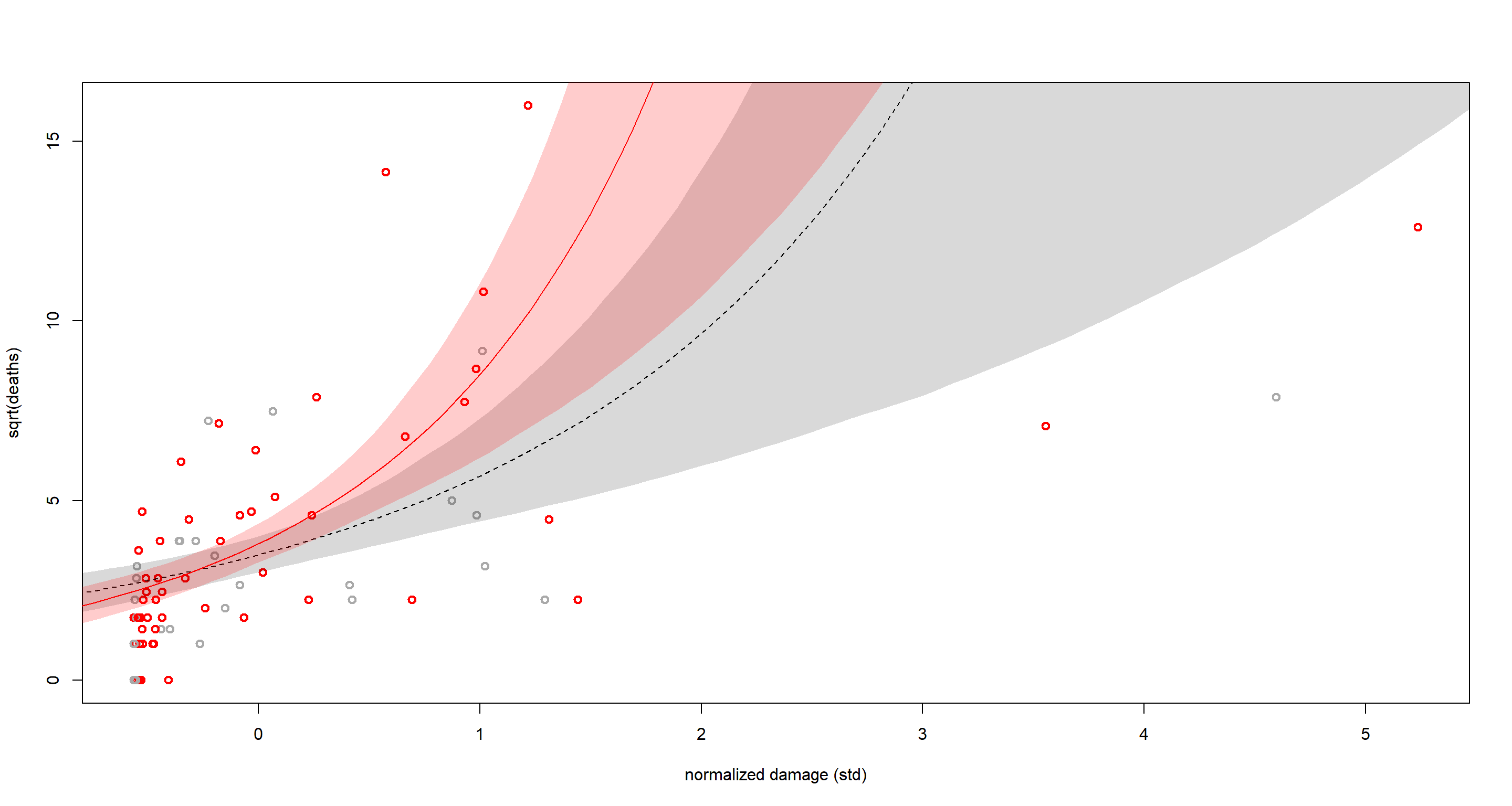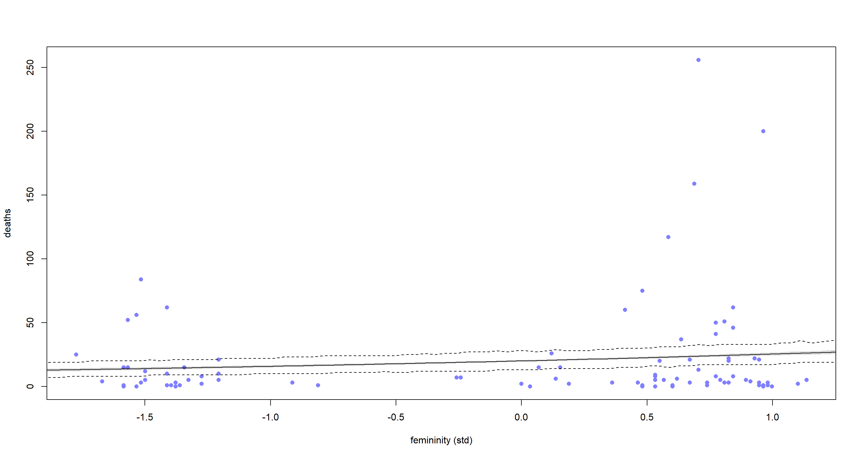 So according to this, there is a positive relationship between hurricane name femininity and death toll. Which hurricanes do we actually retrodict well, though? Let’s plot, this: