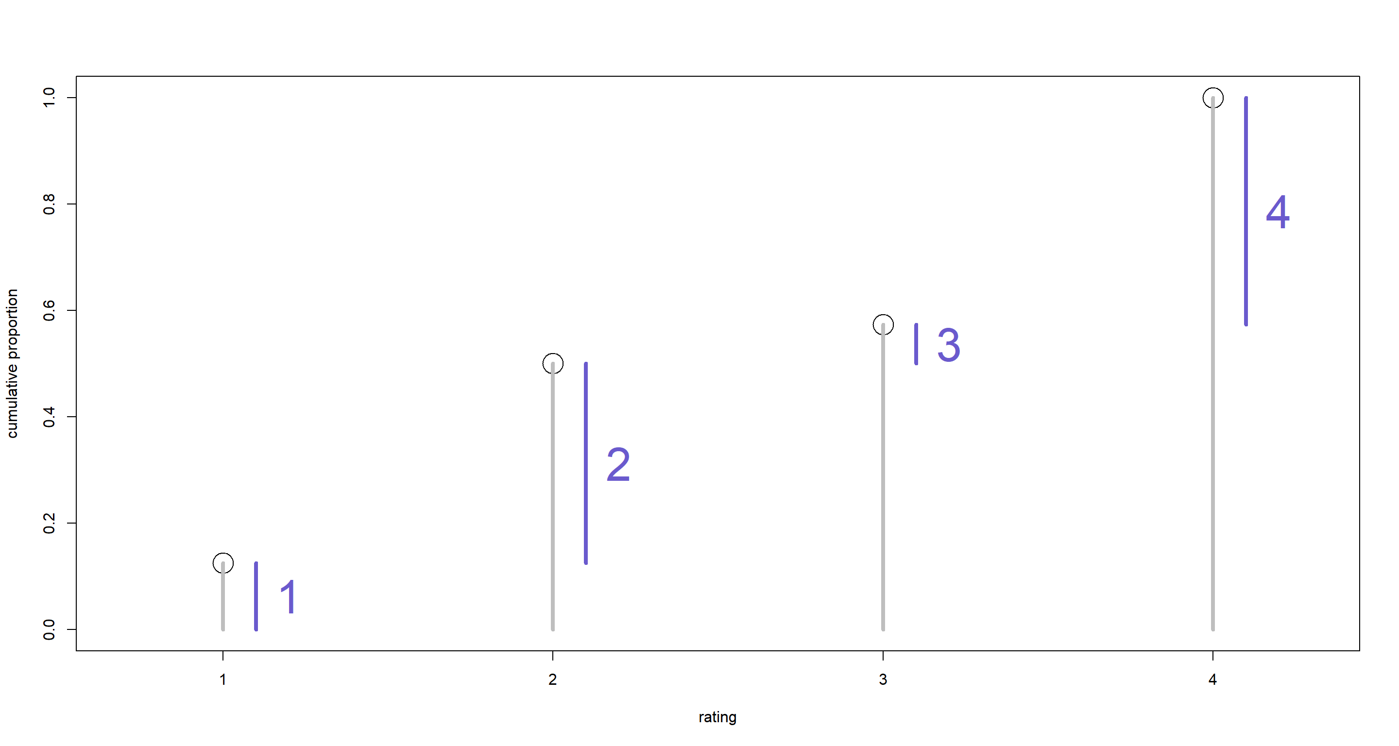 for (x in 1:4) lines(c(x, x) + 0.1, c(p[x] - q[x], p[x]), col = "slateblue", lwd = 4)